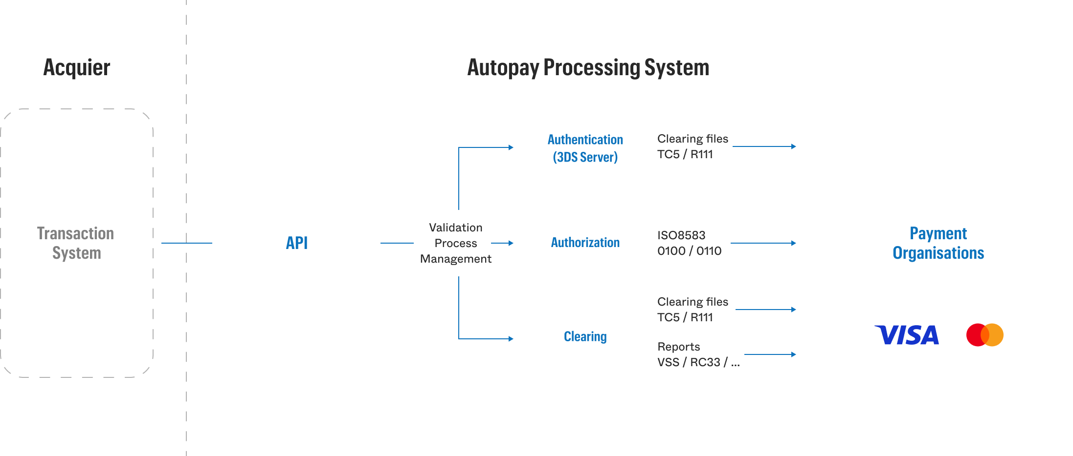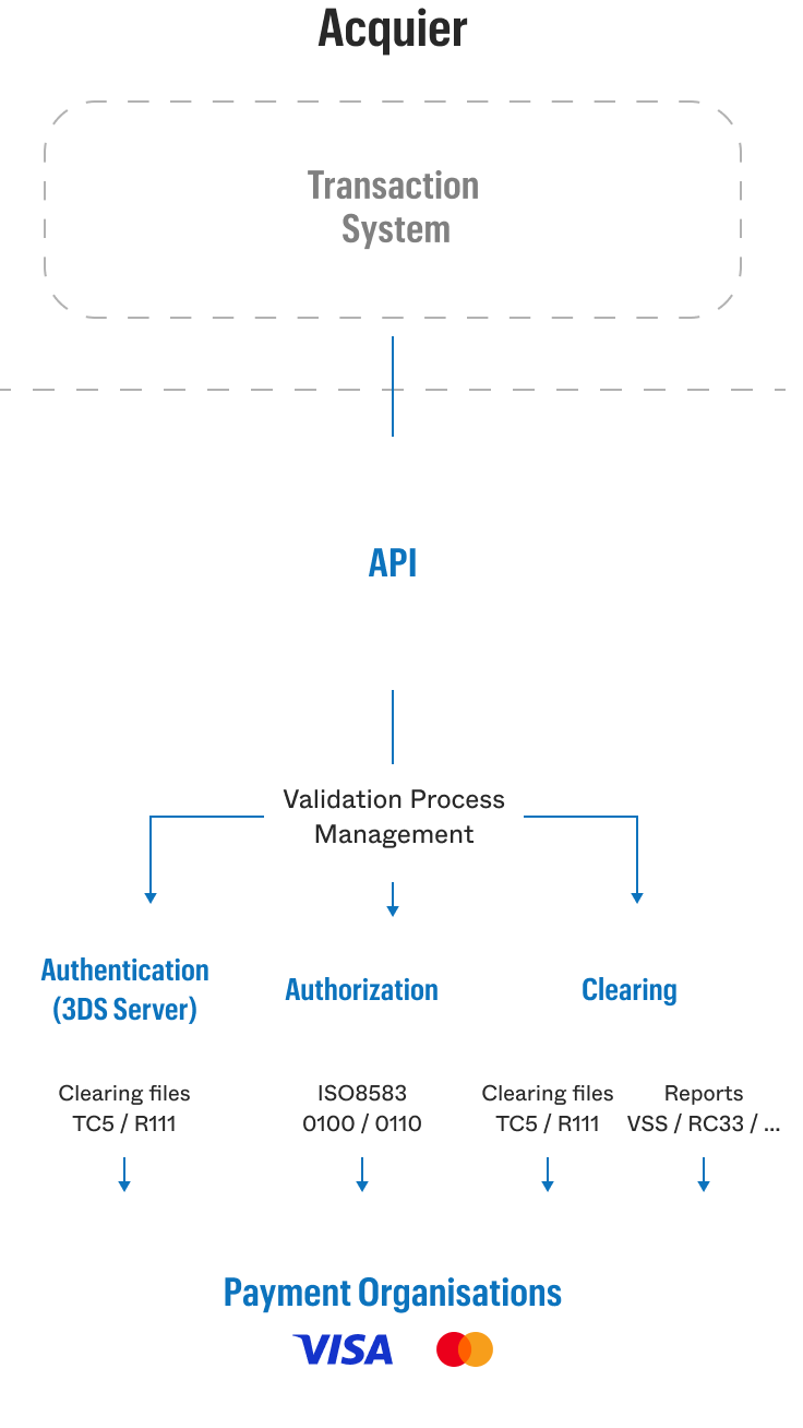 We enable the processing of any types of transactions from payment organizations such as: Purchase / Recurring / Customer Initiated Transaction (CIT) and Merchant Initiated Transaction (MIT) Initial and subsequent / Token / Click2Pay / Account Verification Services (AVS) / Mail order / Telephone order (MOTO) / Dynamic Currency Conversion (DCC).